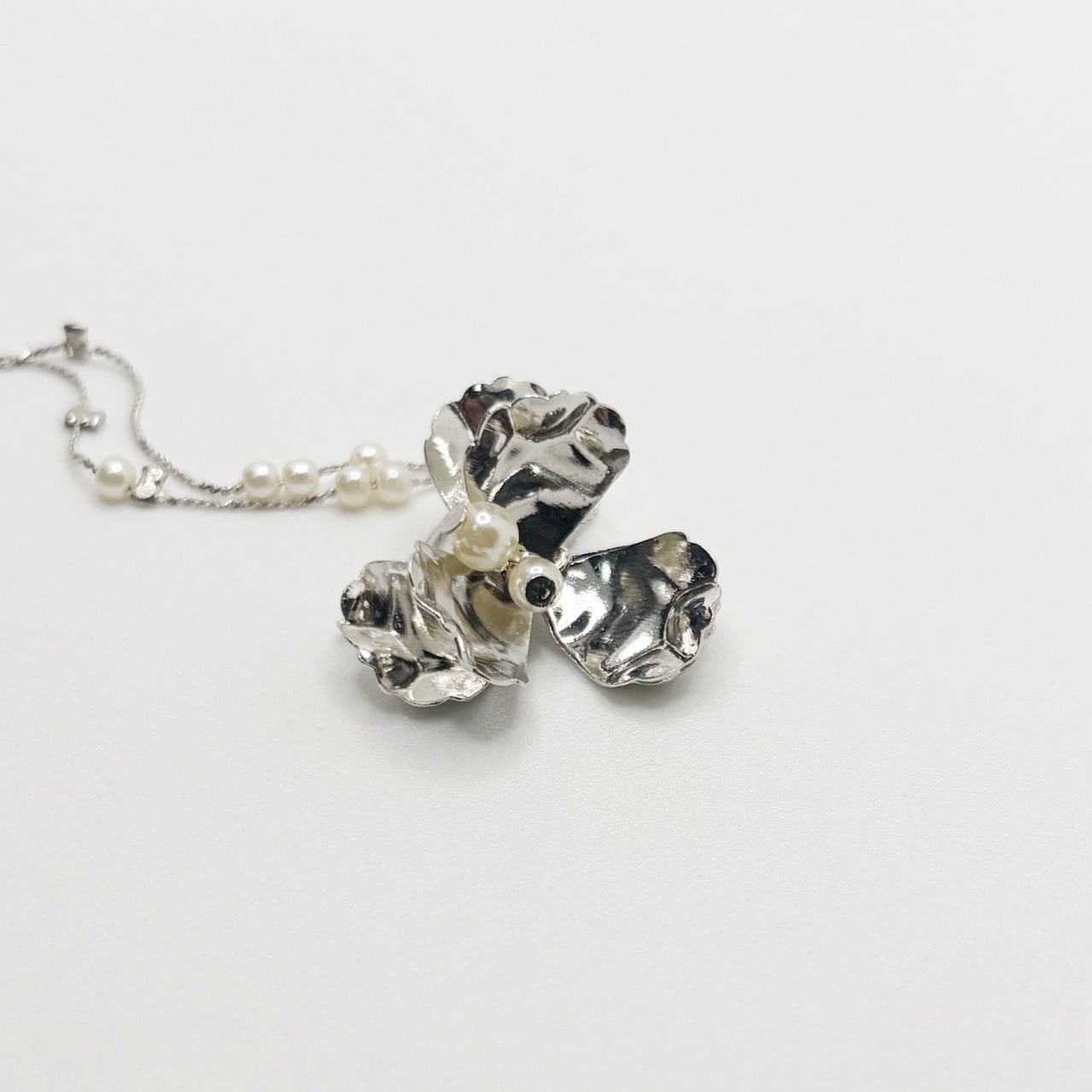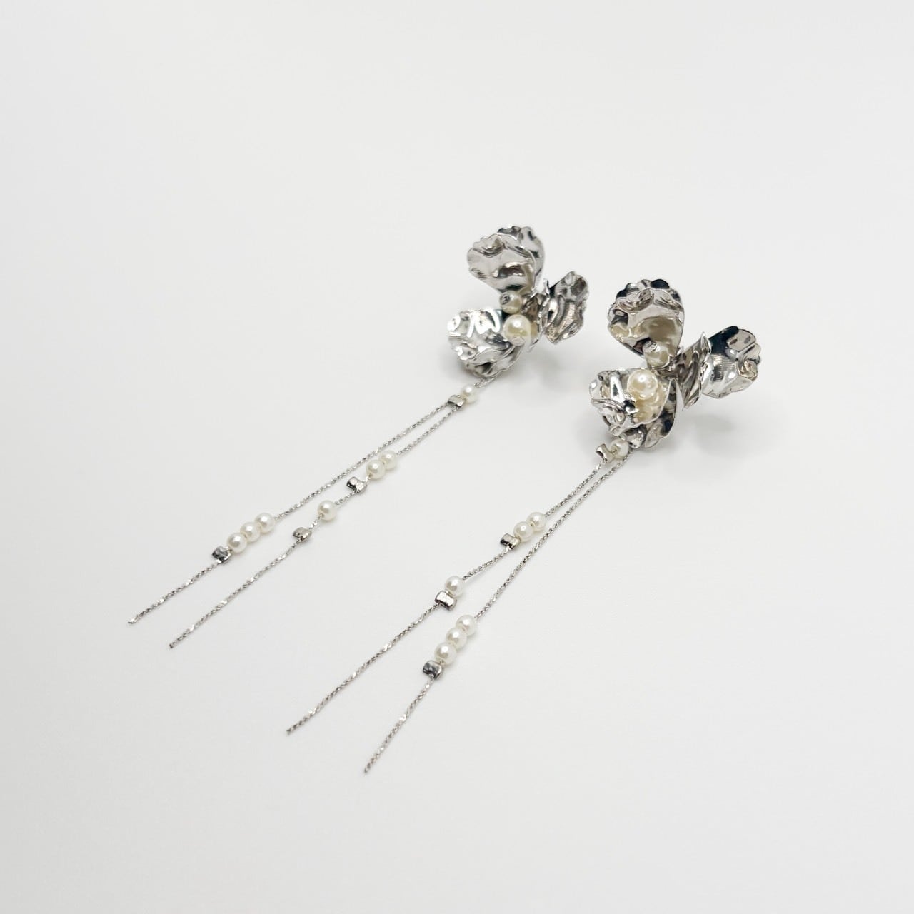 光を受けて表情を変える花びらと繊細に揺れるチェーンが耳元に上品なアクセントを添えます。